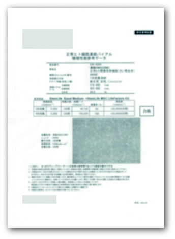 幹細胞の継代数を4回以内に制限し、動物由来成分を一切使用しない無血清培養を徹底。さらに、製造ロットごとに第三者機関による安全性試験(無菌試験、エンドトキシン試験、マイコプラズマ否定試験)を実施し、全ての基準をクリアした製品のみをお届けしています。